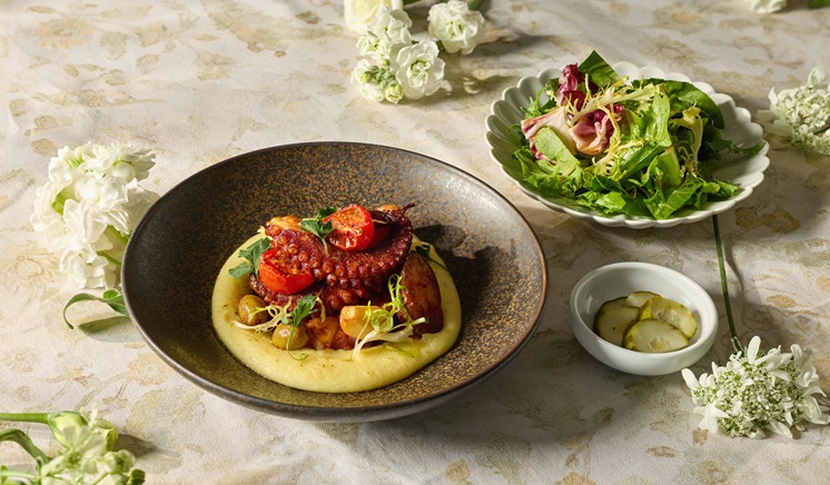 Savor crispy porchetta infused with rich spices, alongside Mediterranean-style polpo featuring buttery octopus and potatoes with a touch of freshness.